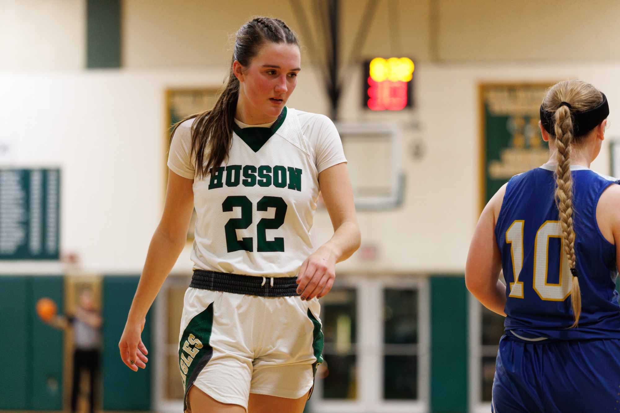 Lyndon took control of the contest out of the gate. After Husson's Sami Ireland (Howland, Maine) scored on the game's first possession, the Hornets rattle off 16 unanswered points to go in front 16-2, less than five minutes into the contest. Three pointers from Faith Poirier and Hodge keyed the burst. The visiting Eagles responded with six straight points on a pair of Joan Overman (Washburn, Maine) field goals bookending two free throws from Emma Alley (Millinocket, Maine). Another Piorier three then ignited an 8-2 Hornet run to close the quarter with Lyndon in front, 24-10.
